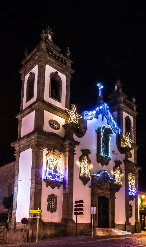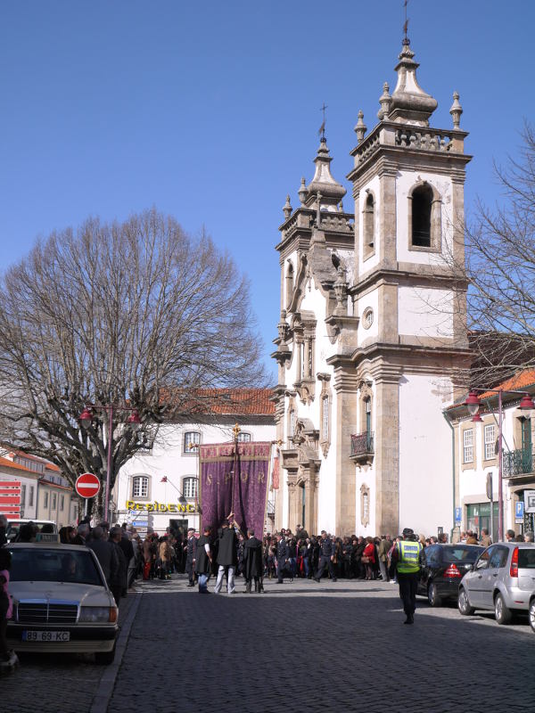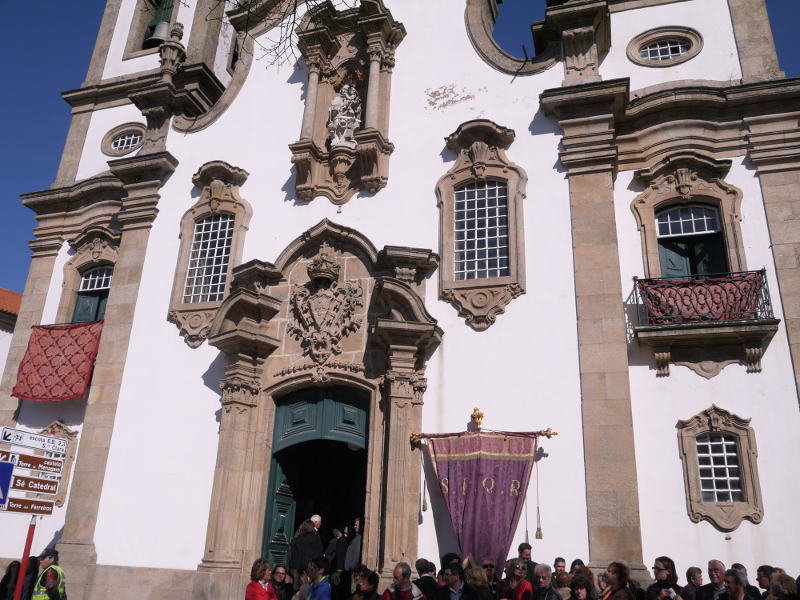 As ventanas são de arco de volta inteira. Os cubelos das torres, no remate das cúpulas, são encimados por uma galeria com balaústres. Nos cantos vêem-se fogaréus. O interior desta igreja é monovánico, com cobertura de madeira (meio canhão). O coro assenta sobre um arco abatido, muito bem calculado, longo e elegante. Os altares e púlpitos são barrocos. As galerias laterais, em que se prolonga o coro, fazem-nos pensar numa influência jesuíta. Na parte exterior da capela-mor há um cruzeiro ladeado por dois fogaréus.