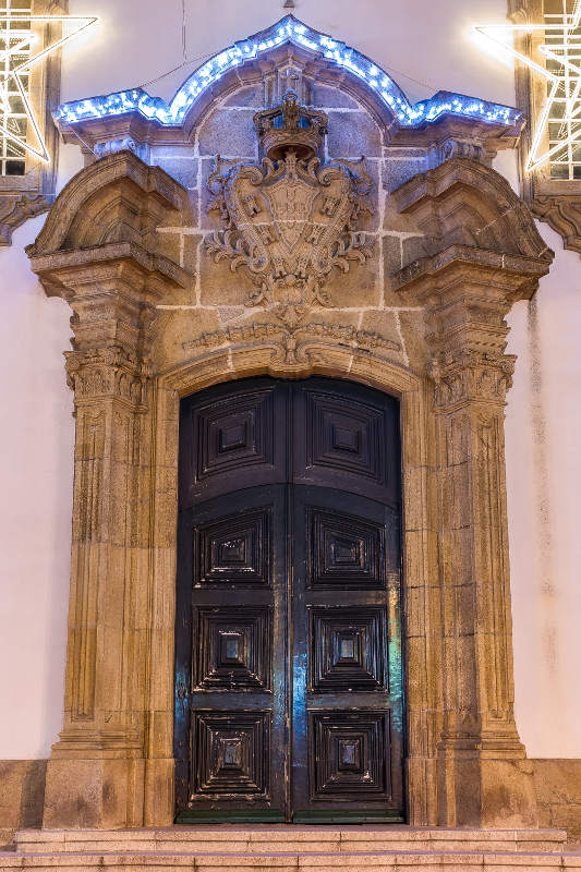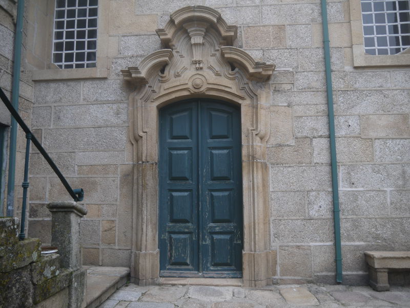 O portal é ladeado por pilastras quadrangulares, encimadas por capiteis com um misto de coríntio e jónico num arranjo compósito. Sobre estes, levanta-se um frontão partido, onde assenta, como fecho, um arco conopial.